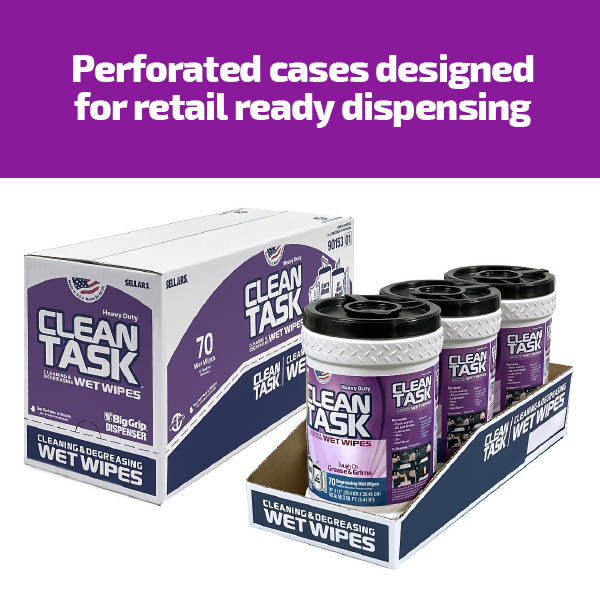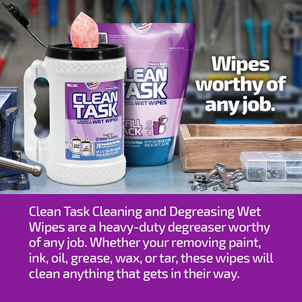 A powerful hand and surface degreasing cleaner that’s gentle on your skin. Clean Task ™ Wet Wipes have a unique non-scratching, scrubbing texture that cuts thru oil, tar, grease, paint, lubricants, ink, wax, adhesives & more. Clean Task ™ Wet Wipes are ideal for light or heavy-duty cleaning of hands and/or surfaces without the need for soap and water. Compare to Scrubs-In-A-Bucket®*